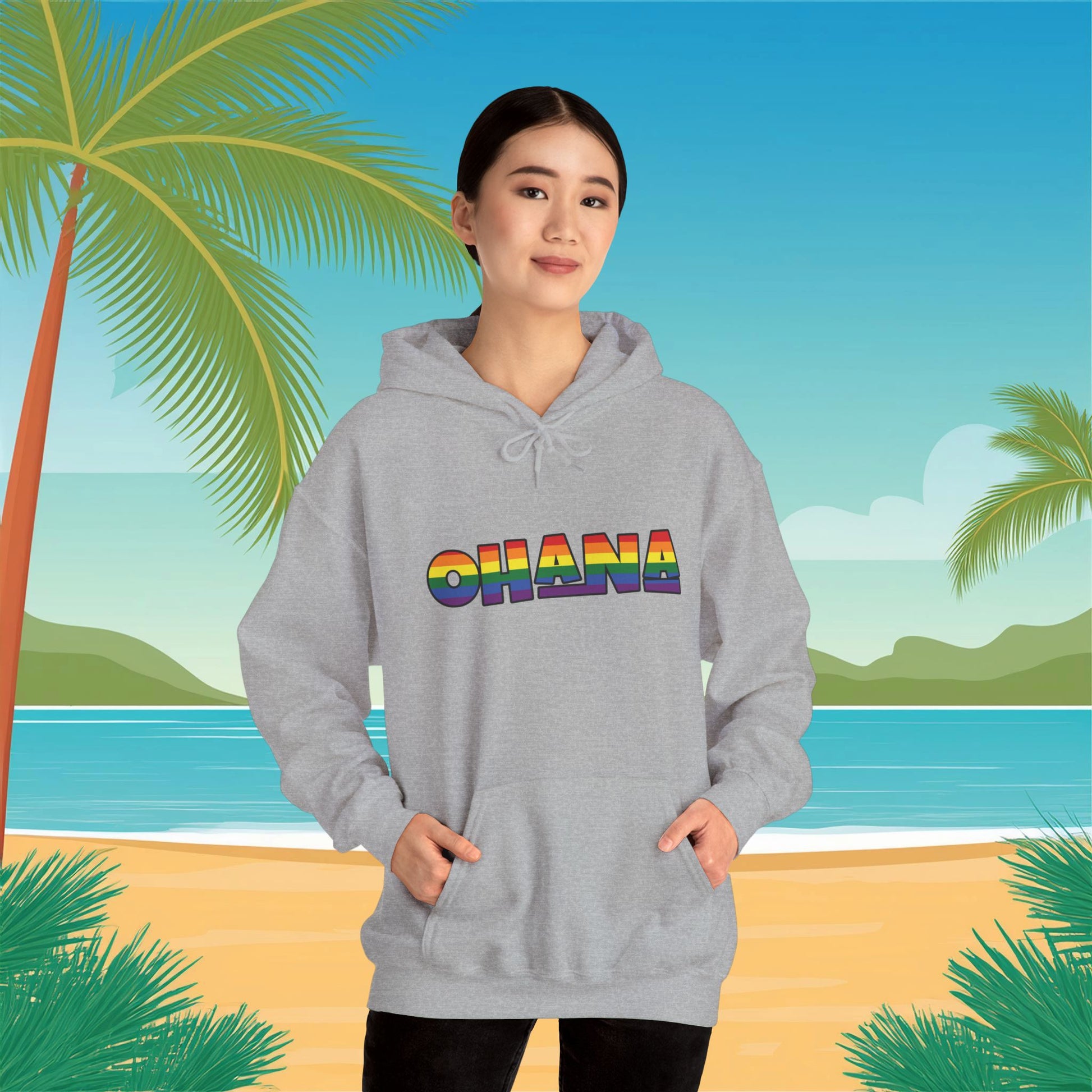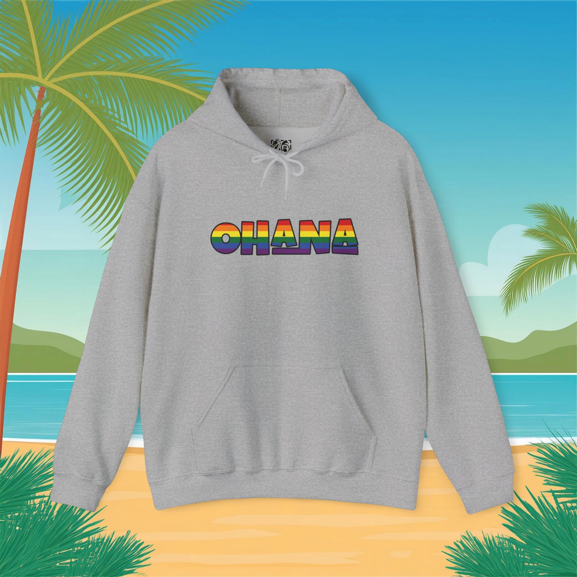 Embrace comfort and style with this fashionable Pride themed Ohana Unisex Heavy Blend™ Hooded Sweatshirt. Perfect for chilly days, it features a cozy kangaroo pouch pocket that keeps your hands warm, making it ideal for casual outings or lounging at home. The adjustable drawstring hood adds an extra layer of warmth and customizability, while its soft fabric blends ensure a comfy fit. This sweatshirt radiates a relaxed, cheerful vibe, making it the perfect companion for gatherings, beach days, or cozy nights in. Ideal for friends and family looking to celebrate love, unity, or simply the joy of being together. Great as a gift for birthdays, holidays, or just because!