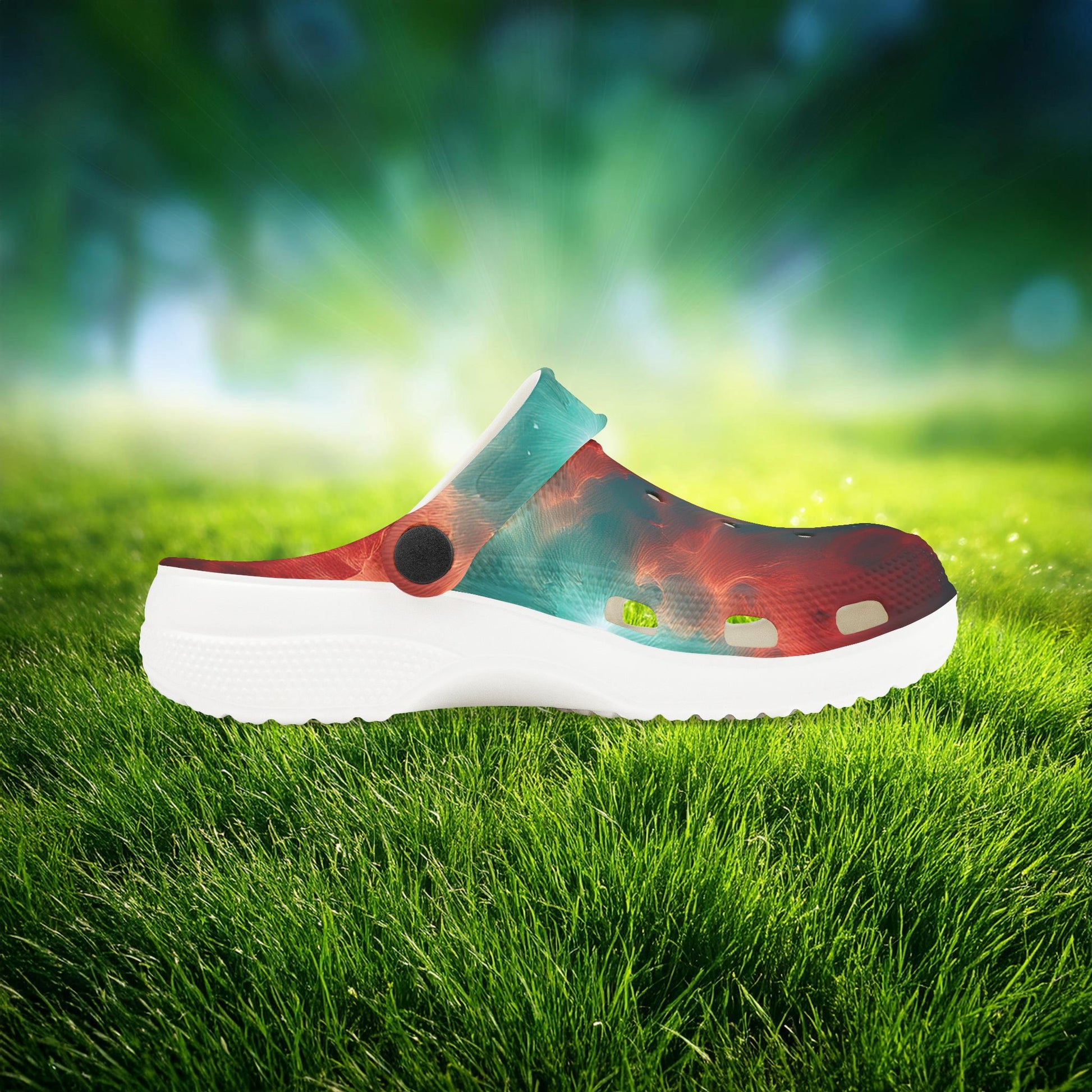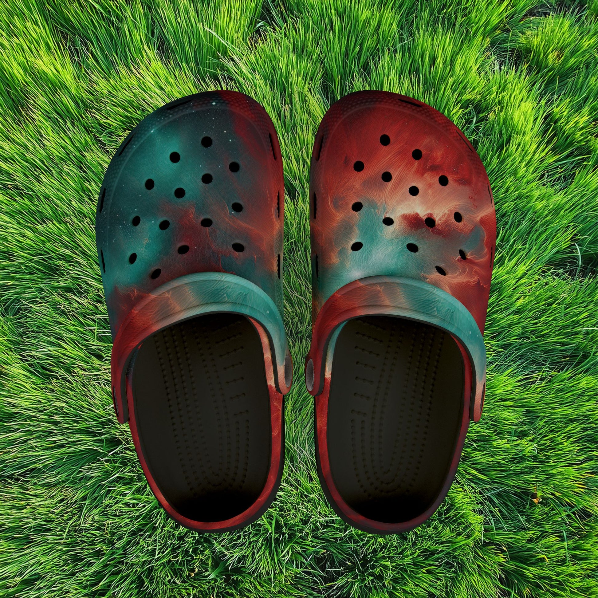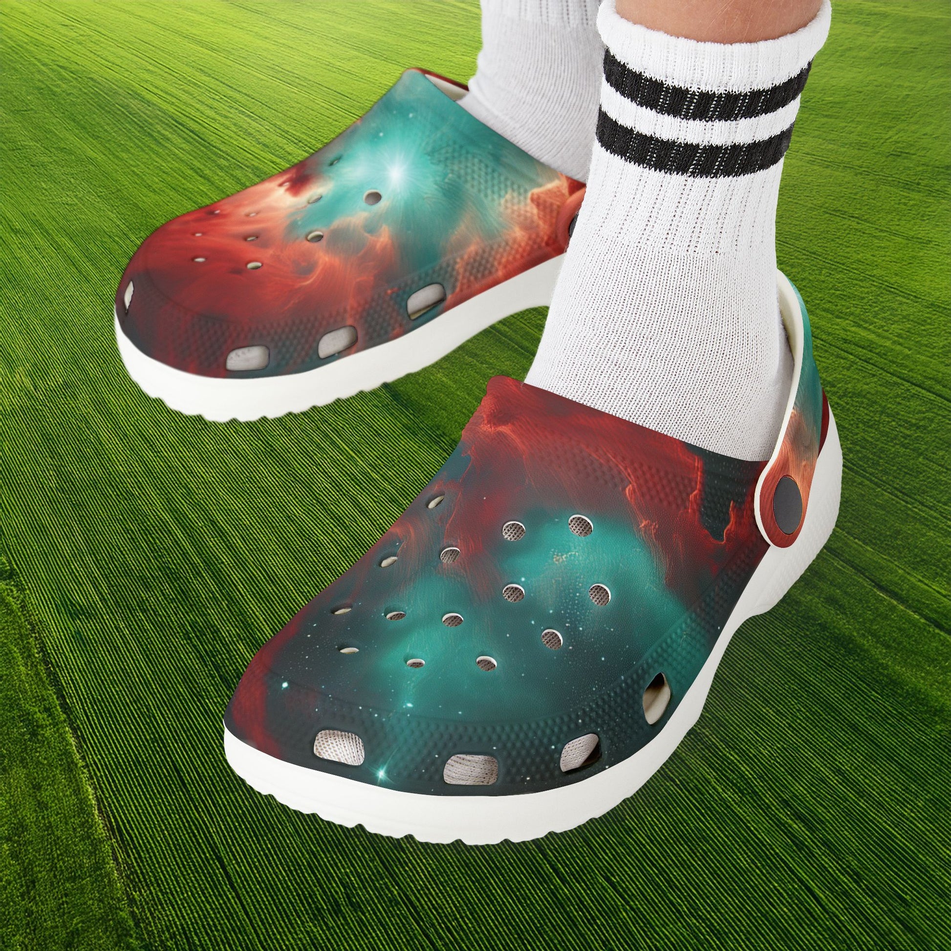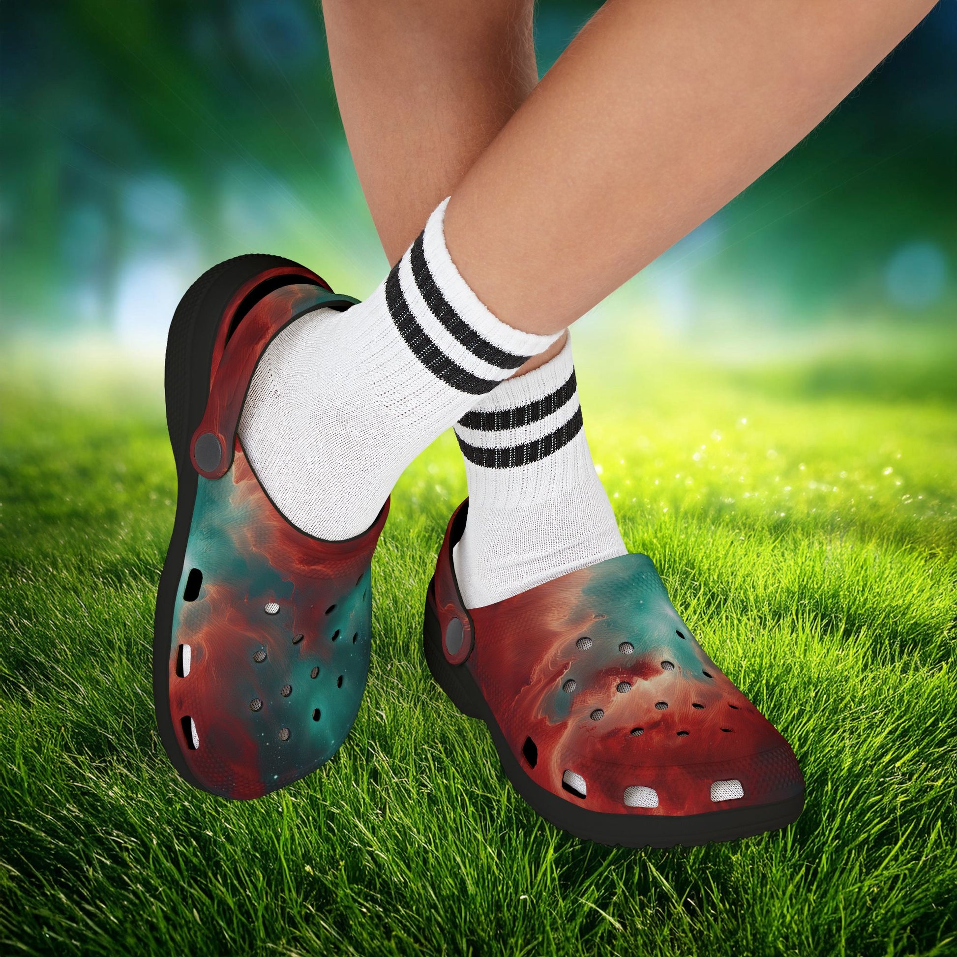 The perfect companion to a kid's adventure is here -- meet the red galaxy clogs for kids. Made with EVA foam, they offer a plush feel for day-long coziness, excellent arch support, and shock absorption for hard surfaces. The design adds a unique touch, showcasing vibrant personality and style.