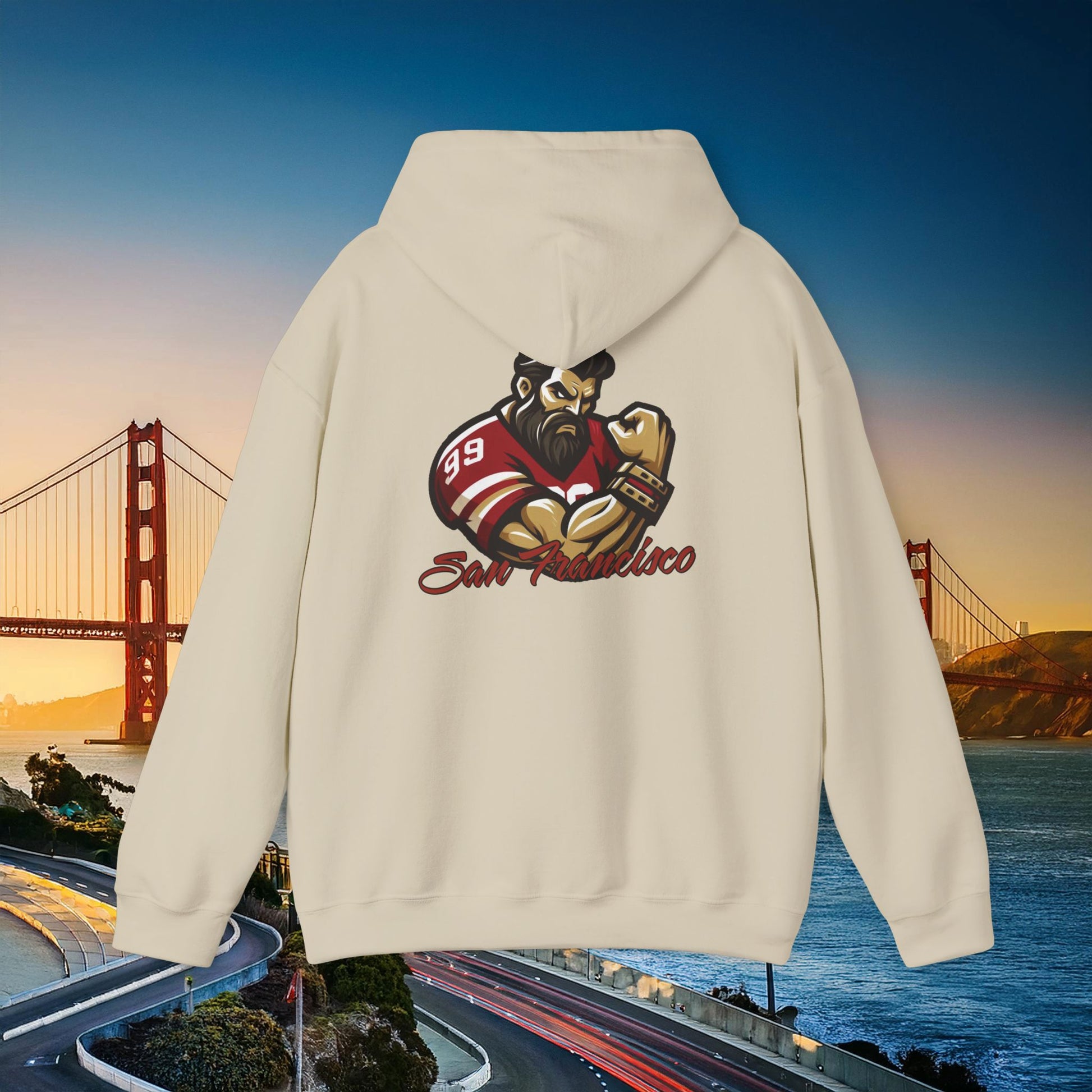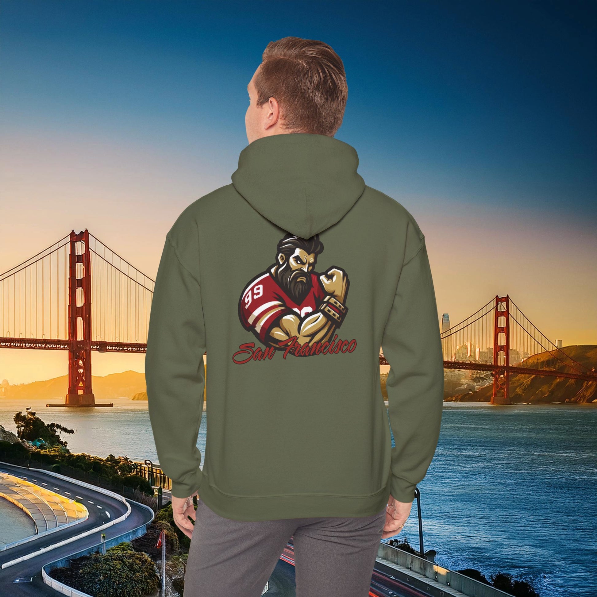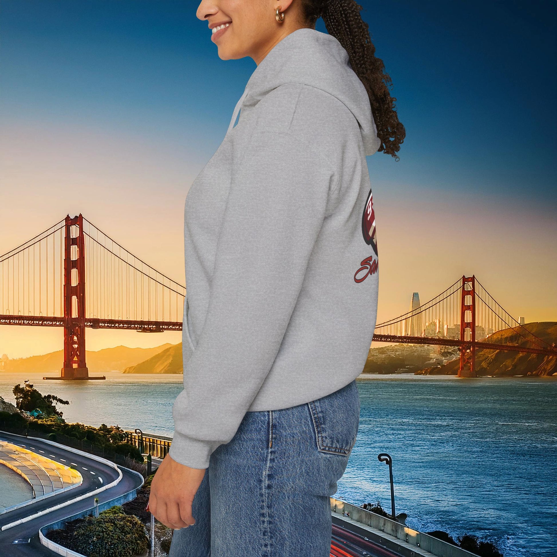 This San Francisco 49ers themed heavy blend hooded sweatshirt is relaxation itself. Made with a thick blend of cotton and polyester, it feels plush, soft and warm, a perfect choice for any cold day. In the front, the spacious kangaroo pocket adds daily practicality while the hood's drawstring is the same color as the base sweater for extra style points.