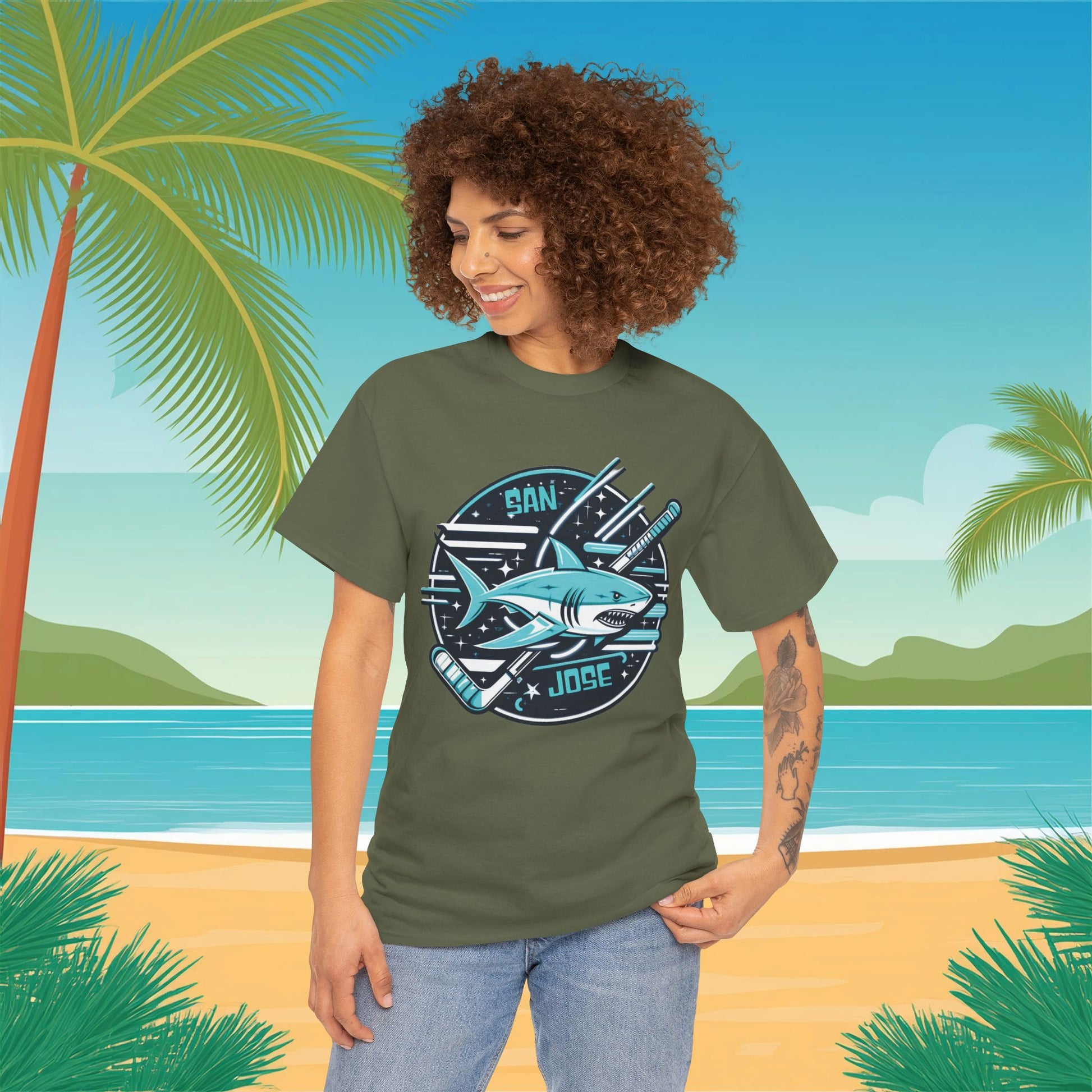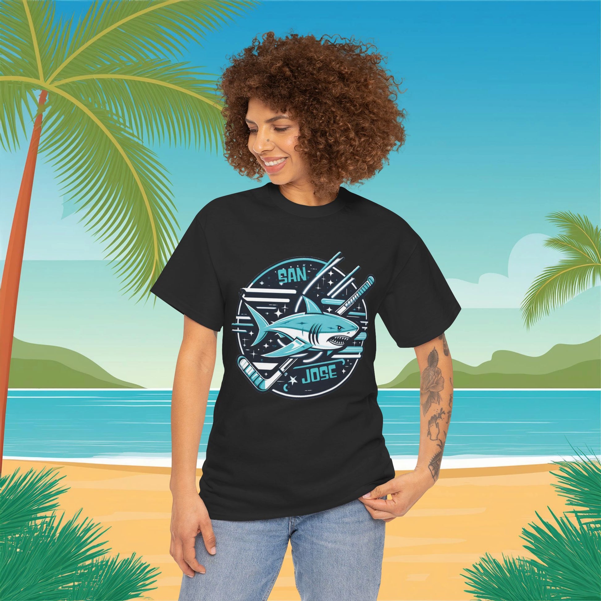 This San Jose Sharks themed heavy cotton tee is the basic staple of any wardrobe. It is the foundation upon which casual fashion grows. The specially spun fibers provide a smooth surface for premium printing vividity and sharpness. No side seams mean there are no itchy interruptions under the arms. The shoulders have tape for improved durability.