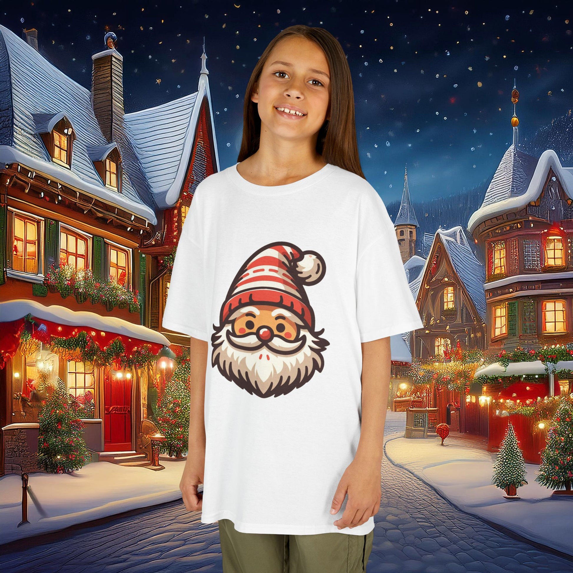 This Santa kids heavy cotton tee is perfect for everyday use. The fabric is 100% cotton for solid colors. Polyester is included for heather-color variants. The shoulders have twill tape for improved durability. The collar is curl resistant due to ribbed knitting. There are no seams along the sides.