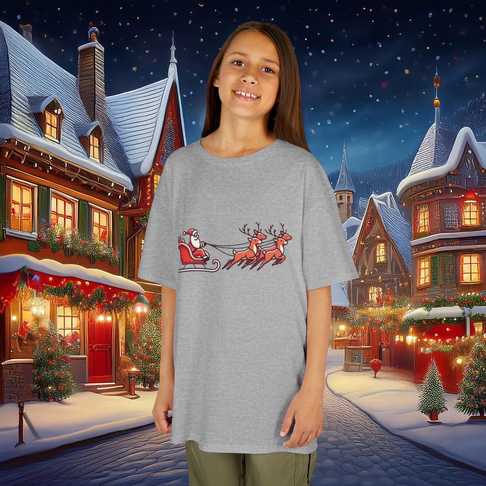 This Christmas themed kids heavy cotton tee is perfect for everyday use. The fabric is 100% cotton for solid colors. Polyester is included for heather-color variants. The shoulders have twill tape for improved durability. The collar is curl resistant due to ribbed knitting. There are no seams along the sides.