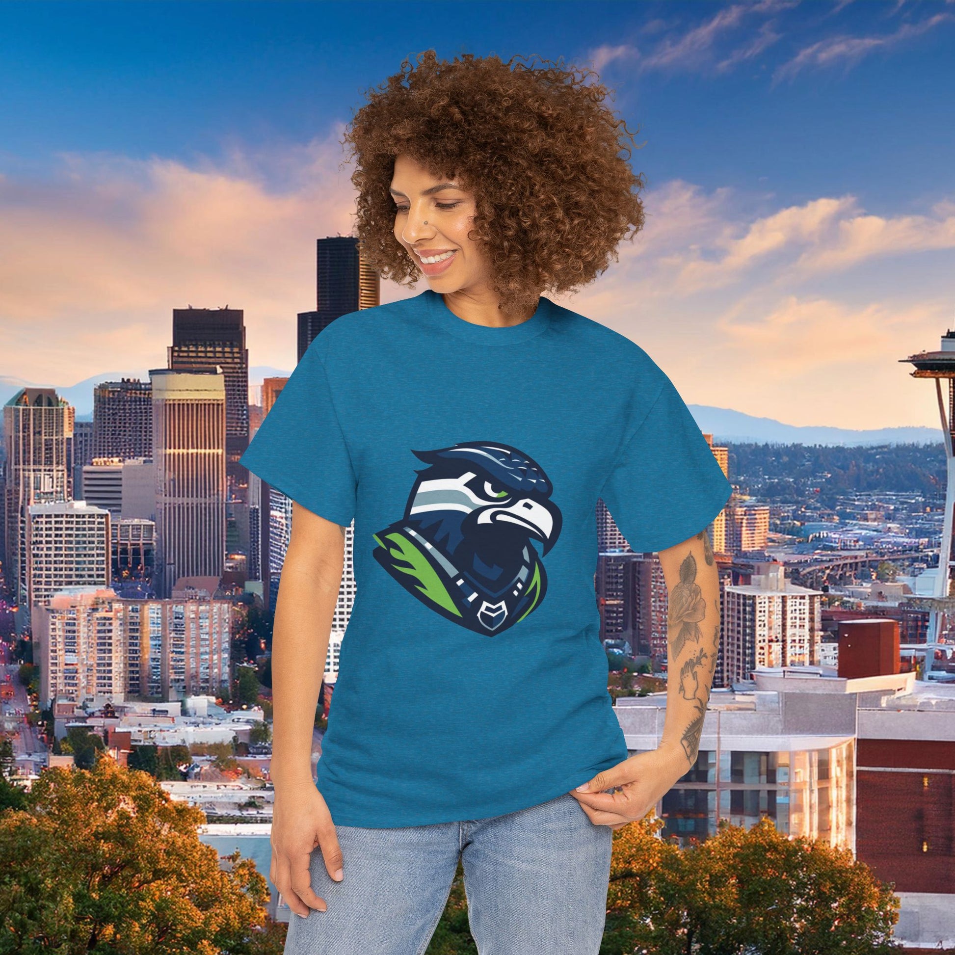 This Seattle Seahawks themed heavy cotton tee is the basic staple of any wardrobe. It is the foundation upon which casual fashion grows. The specially spun fibers provide a smooth surface for premium printing vividity and sharpness. No side seams mean there are no itchy interruptions under the arms. The shoulders have tape for improved durability.