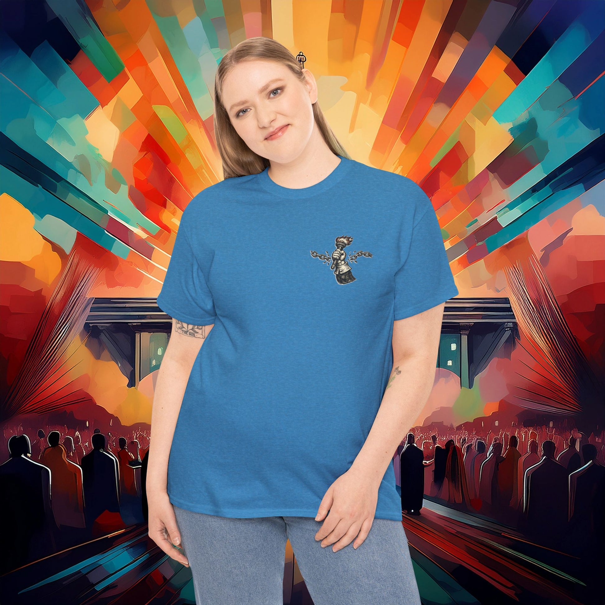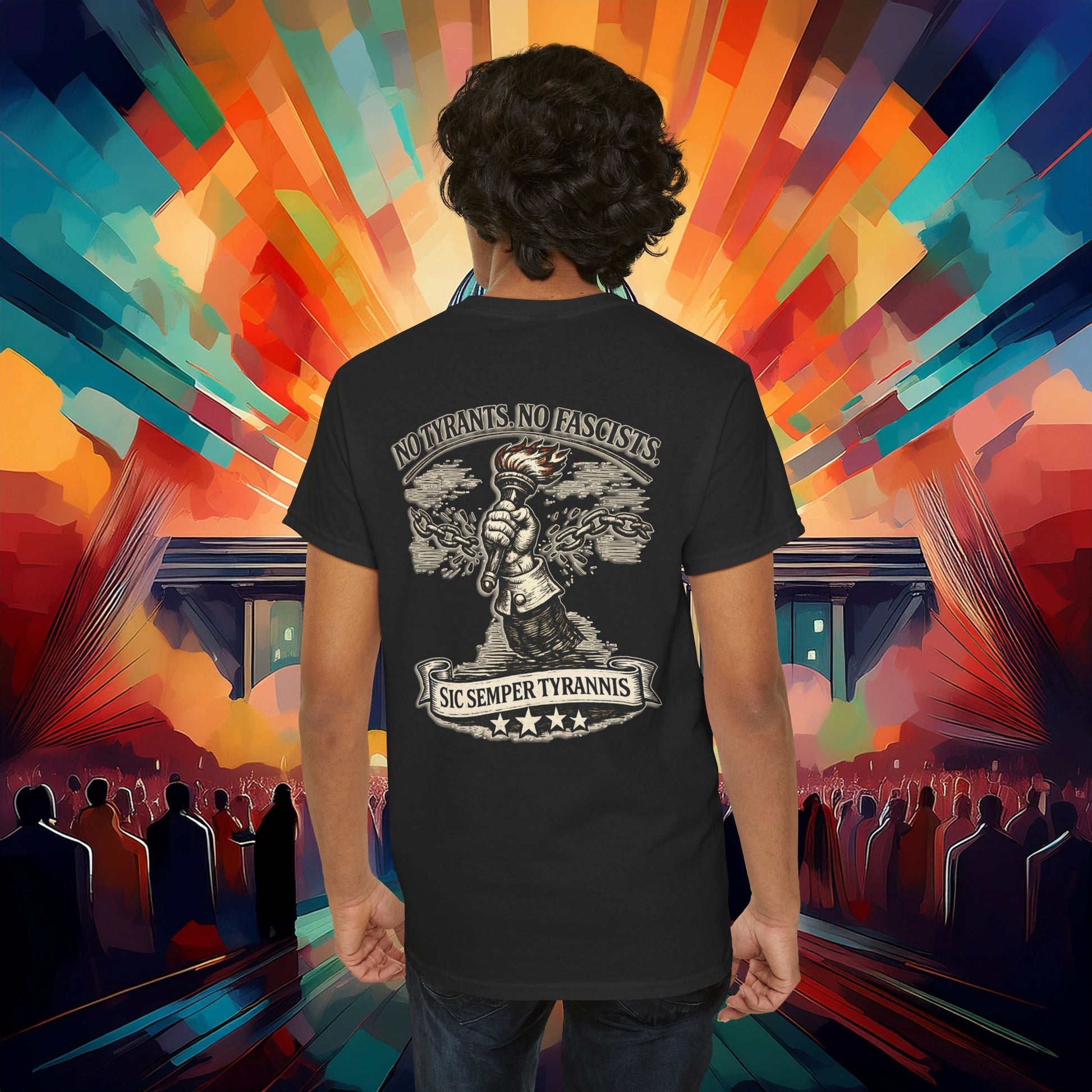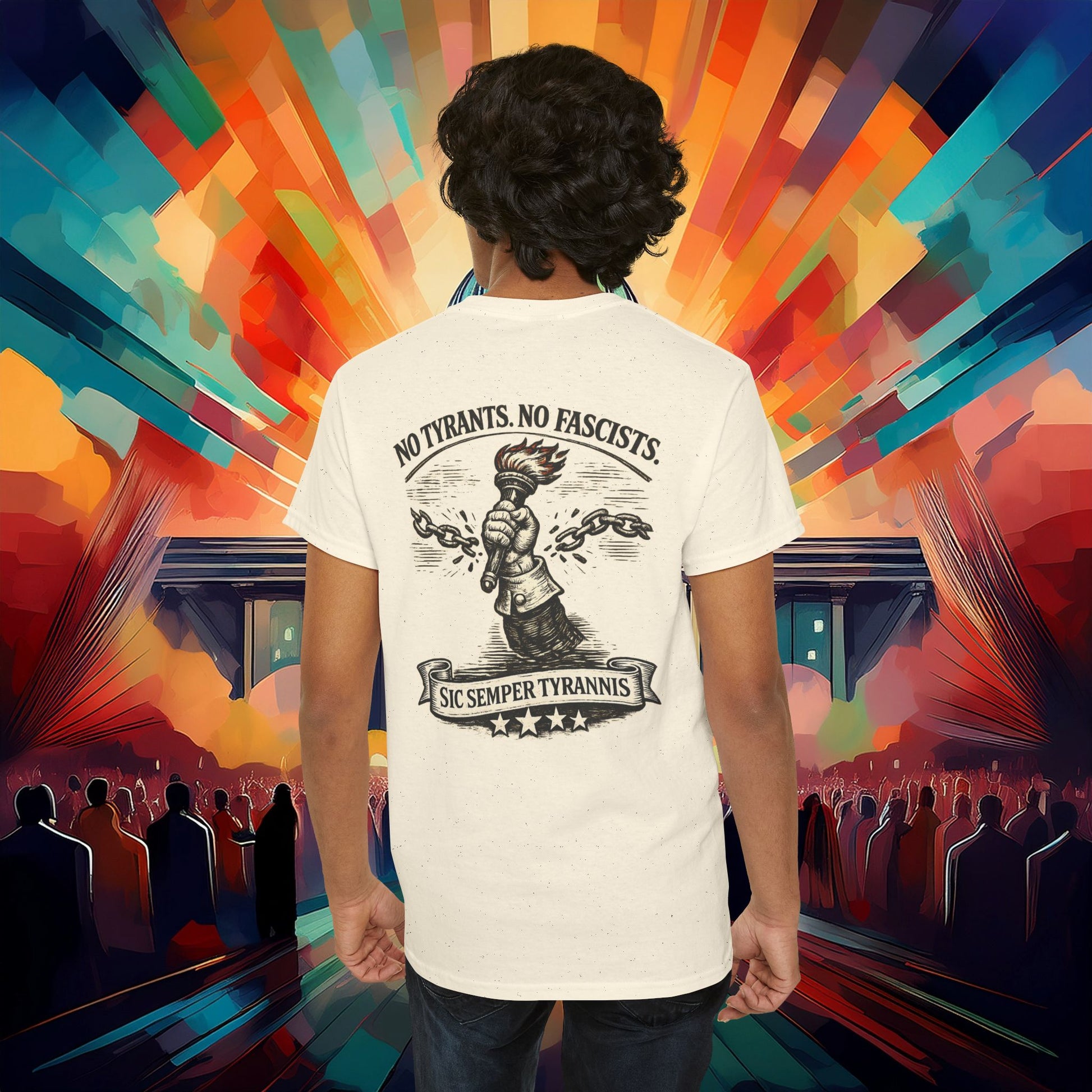 A rugged, statement tee that carries a clear message: resistance and liberty. Soft, midweight cotton sits close to the skin while the chest and back art—rendered with crisp printing—show a broken chain and a raised torch, accompanied by the phrase Sic Semper Tyrannis and a call against tyrants and fascists. Wear it to rallies, meetups, or casual weekends when you want your clothing to speak with quiet strength. The classic crew cut and tubular knit body keep the silhouette clean and comfortable, while the ribbed collar and shoulder tape hold shape through repeated wear. Tear-away label and ethically sourced cotton make it an easy, no-fuss piece to reach for when you want to be seen and heard.