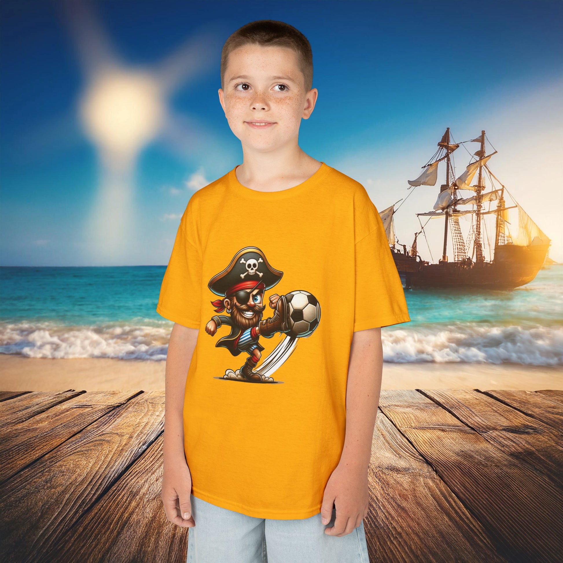This Pirate Soccer kids heavy cotton tee is perfect St Pauli fans or for everyday use. The fabric is 100% cotton for solid colors. Polyester is included for heather-color variants. The shoulders have twill tape for improved durability. The collar is curl resistant due to ribbed knitting. There are no seams along the sides.