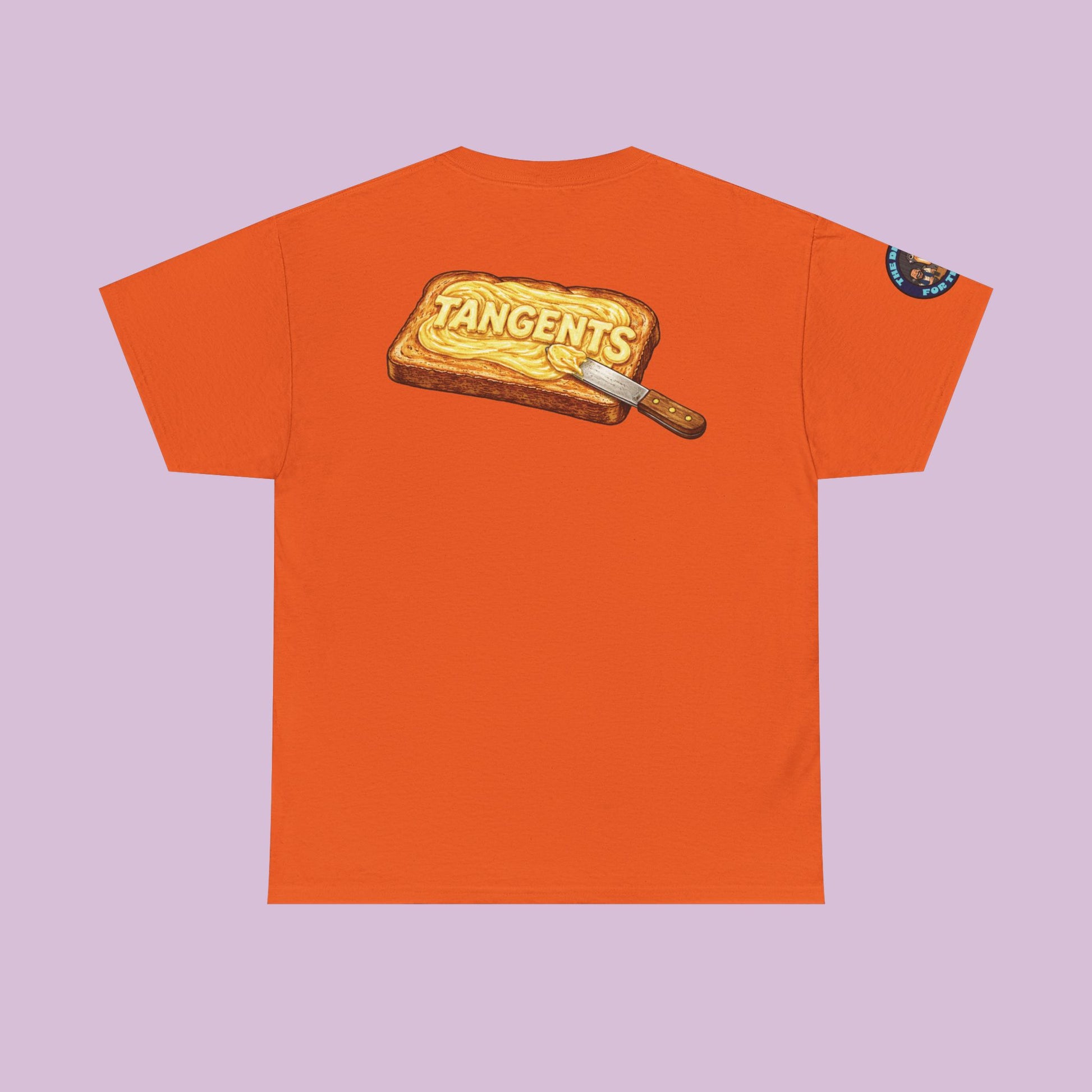 Bite into the smooth and creamy flavor of Tangents! Inspired by the creativity of Mama T and Oz's love for Kerrygold, this tee carries a fun and cozy vibe - like the warm pull of buttered toast and slow Sunday conversations. A small, nostalgic logo on the chest and a larger toasted-bread illustration on the back give the shirt personality without shouting. It slips into everyday life easily: layered under a flannel for chilly mornings, worn solo while sketching or podcasting, or tossed on for low-key meetups with friends who appreciate subtle, clever design. The fabric feels substantial yet breathable, the collar holds its shape, and the tear-away label keeps it comfortable for long wear. It’s made with responsibly sourced cotton and built to last wash after wash, so the design and the feel stay true to the original charm.
