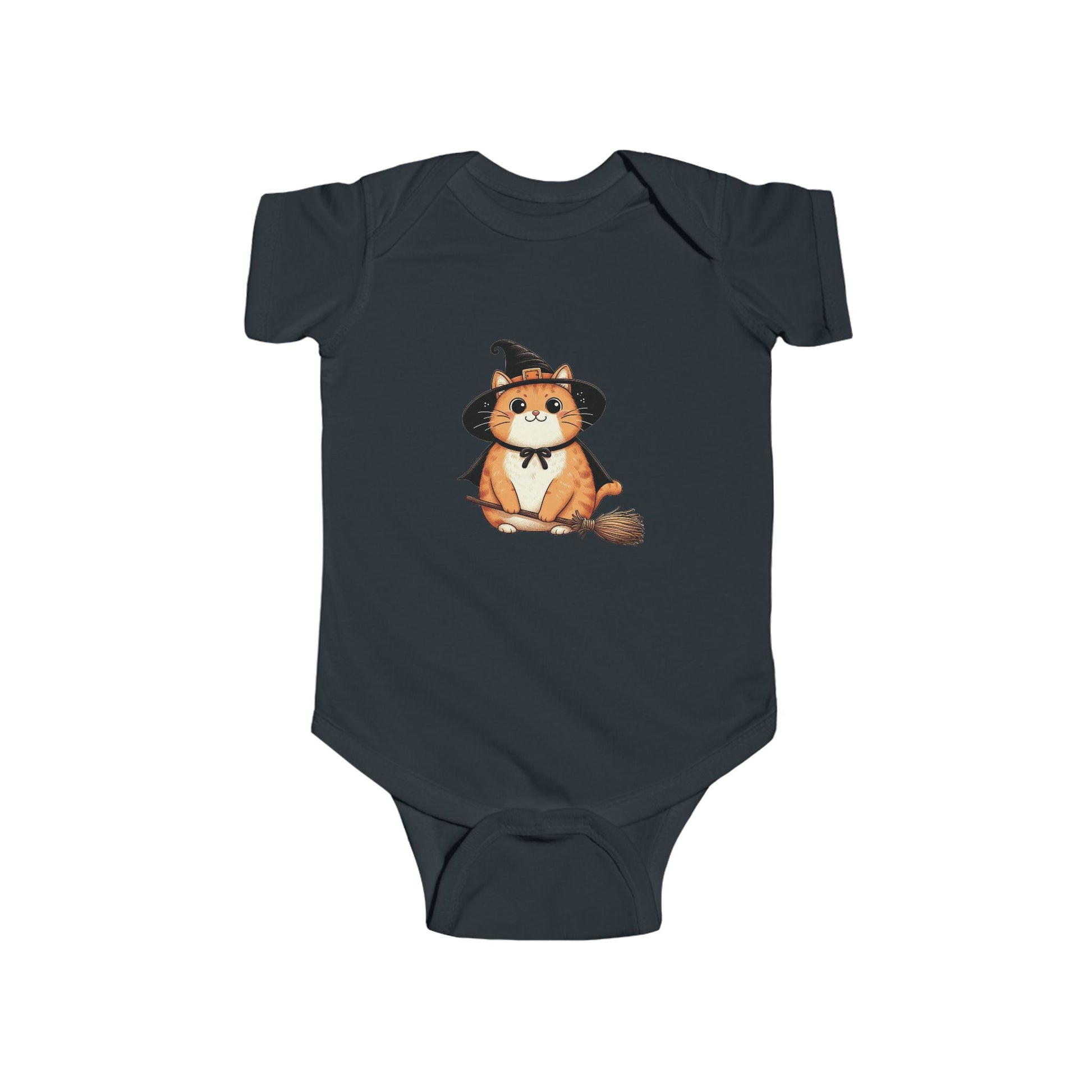 Baby clothing needs to be both durable and soft. With this Halloween themed infant fine jersey bodysuit, youths get just that. The fabric is 100% cotton for solid colors. For heather colors, polyester is included. There are seams along the sides of this product. All bindings are made with ribbed knitting for improved durability. There are plastic snaps at the cross closure for easy changing access.