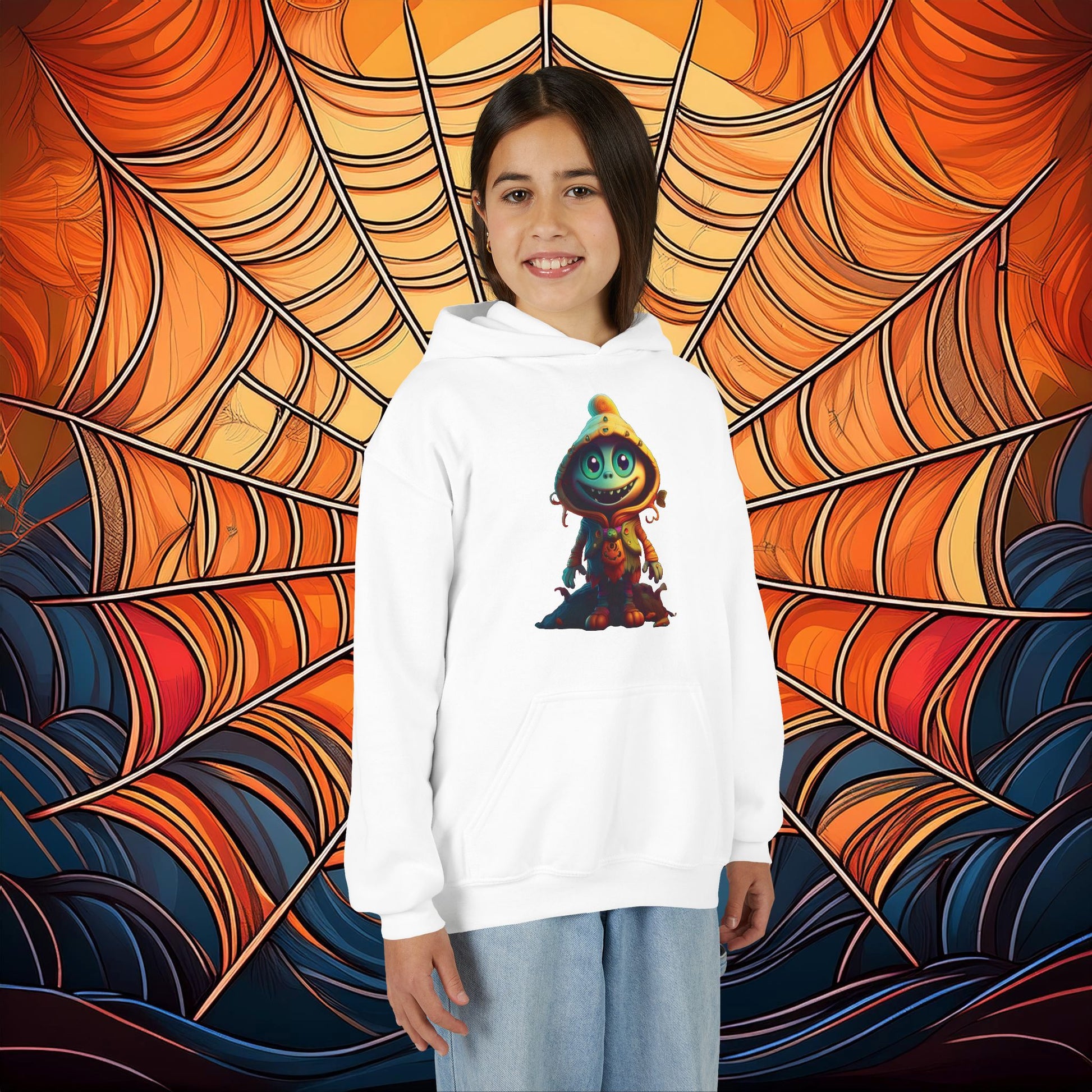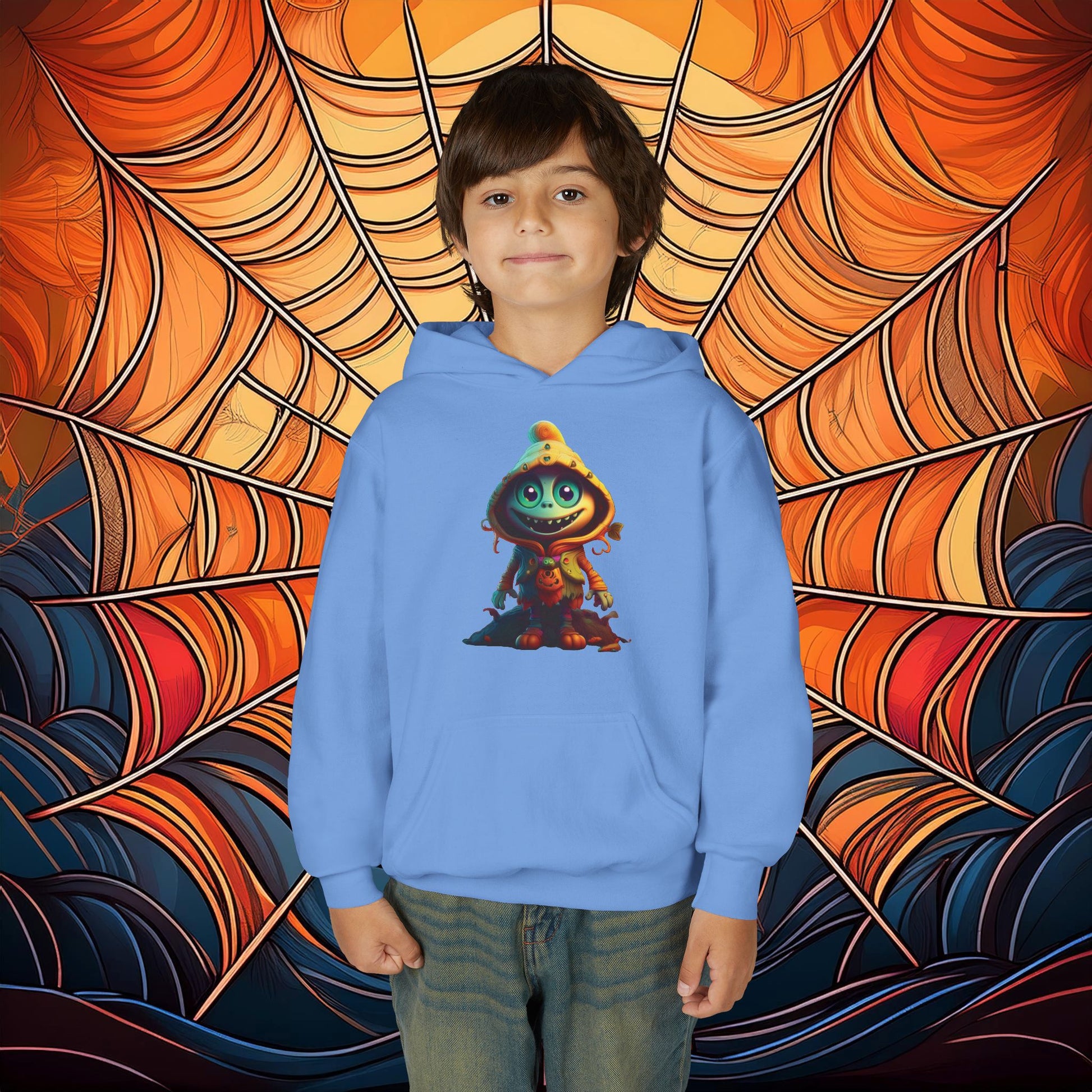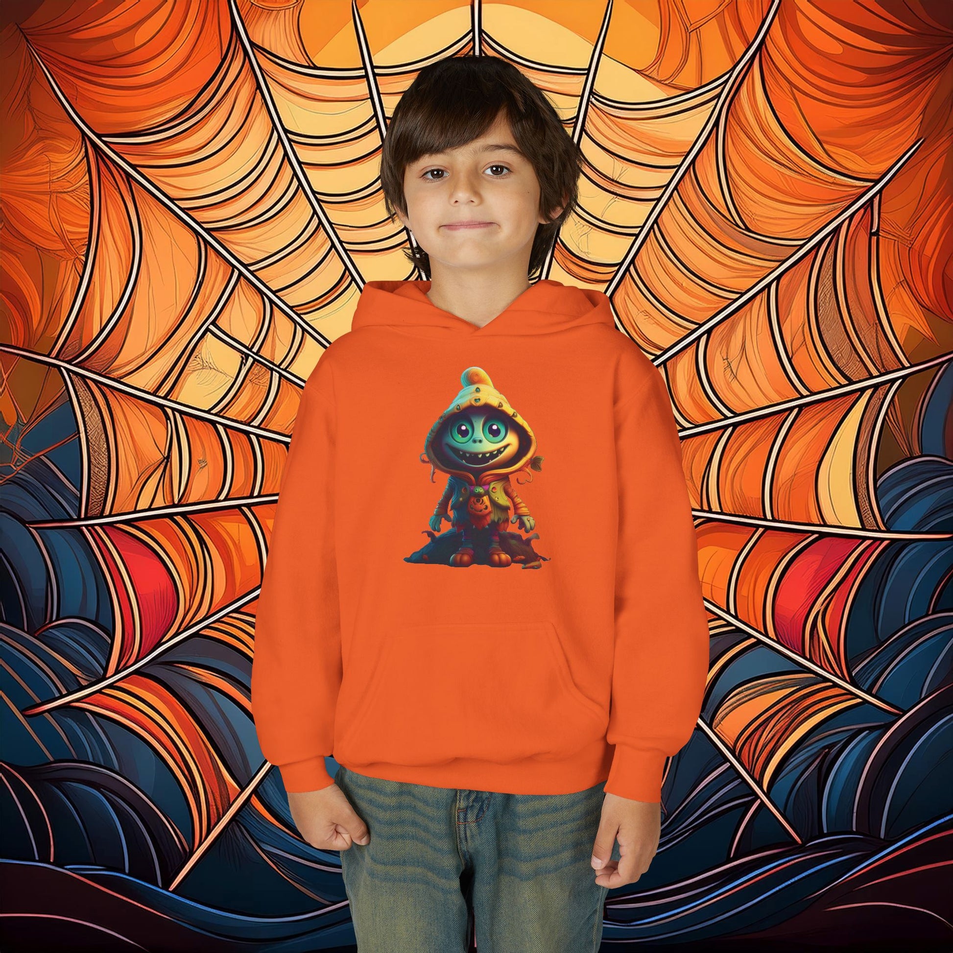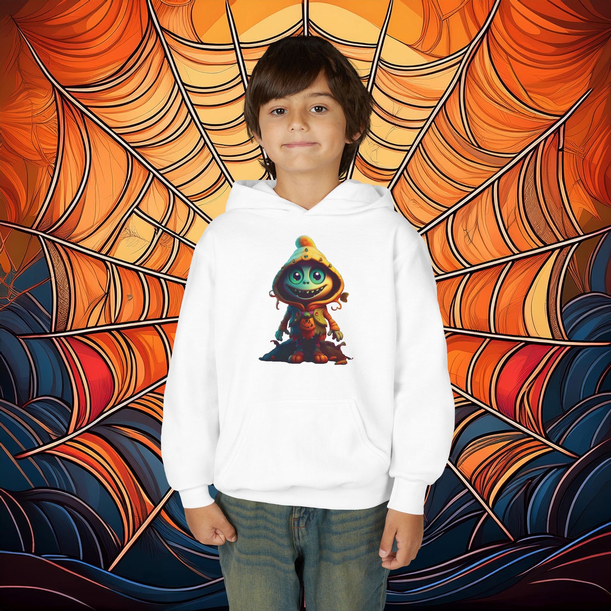This Halloween themed youth blend hooded sweatshirt is made of ultra-soft, preshrunk fleece that feels wonderful against the skin. The garment is 50% cotton 50% polyester with reduced lint buildup. The front has a kangaroo pocket big enough for both hands. The neck is reinforced with twill taping.