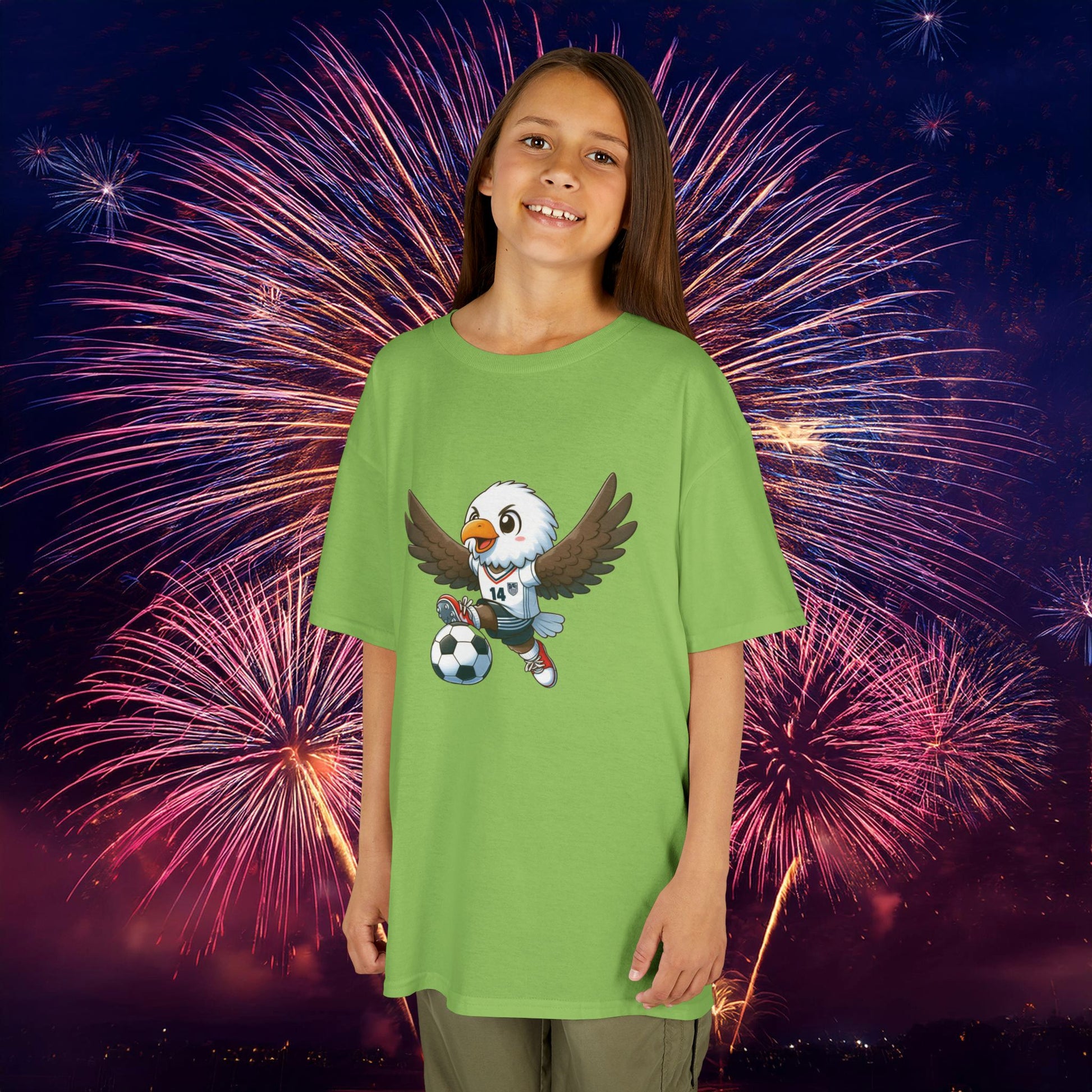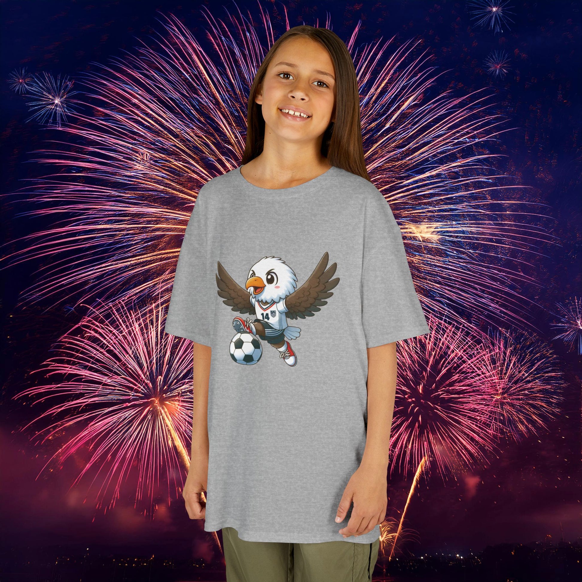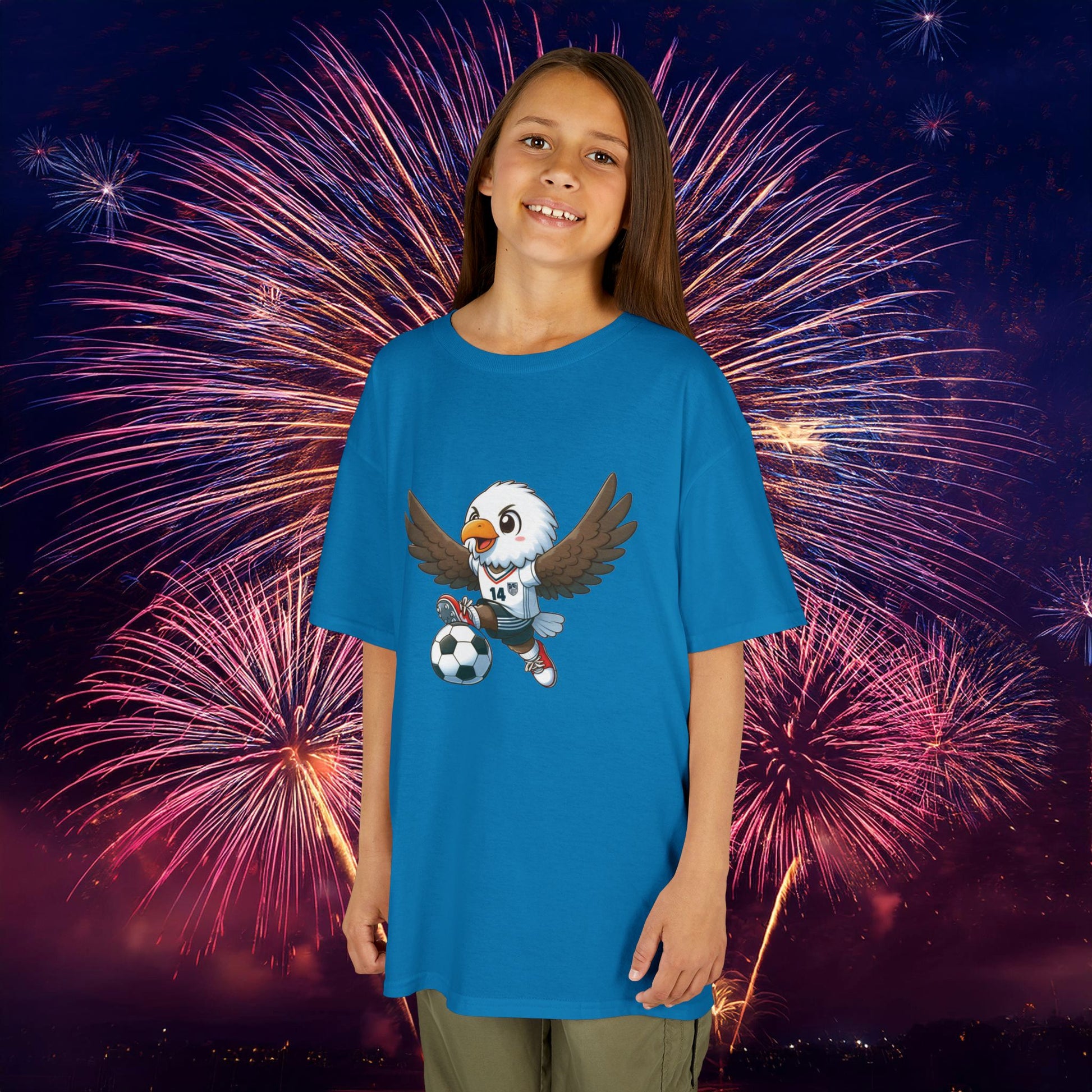 This USA Soccer eagle design kids heavy cotton tee is perfect for everyday use. The fabric is 100% cotton for solid colors. Polyester is included for heather-color variants. The shoulders have twill tape for improved durability. The collar is curl resistant due to ribbed knitting. There are no seams along the sides.