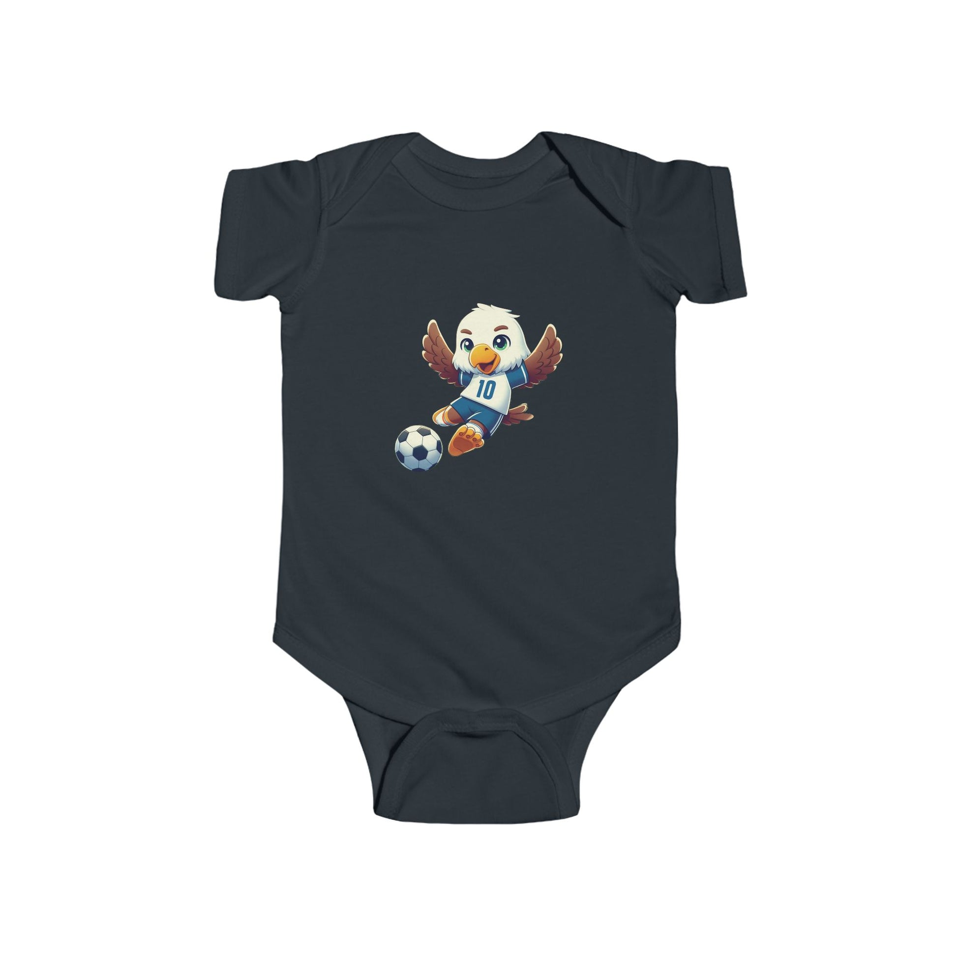 Baby clothing needs to be both durable and soft. With this US soccer themed infant fine jersey bodysuit, youths get just that. The fabric is 100% cotton for solid colors. For heather colors, polyester is included. There are seams along the sides of this product. All bindings are made with ribbed knitting for improved durability. There are plastic snaps at the cross closure for easy changing access.