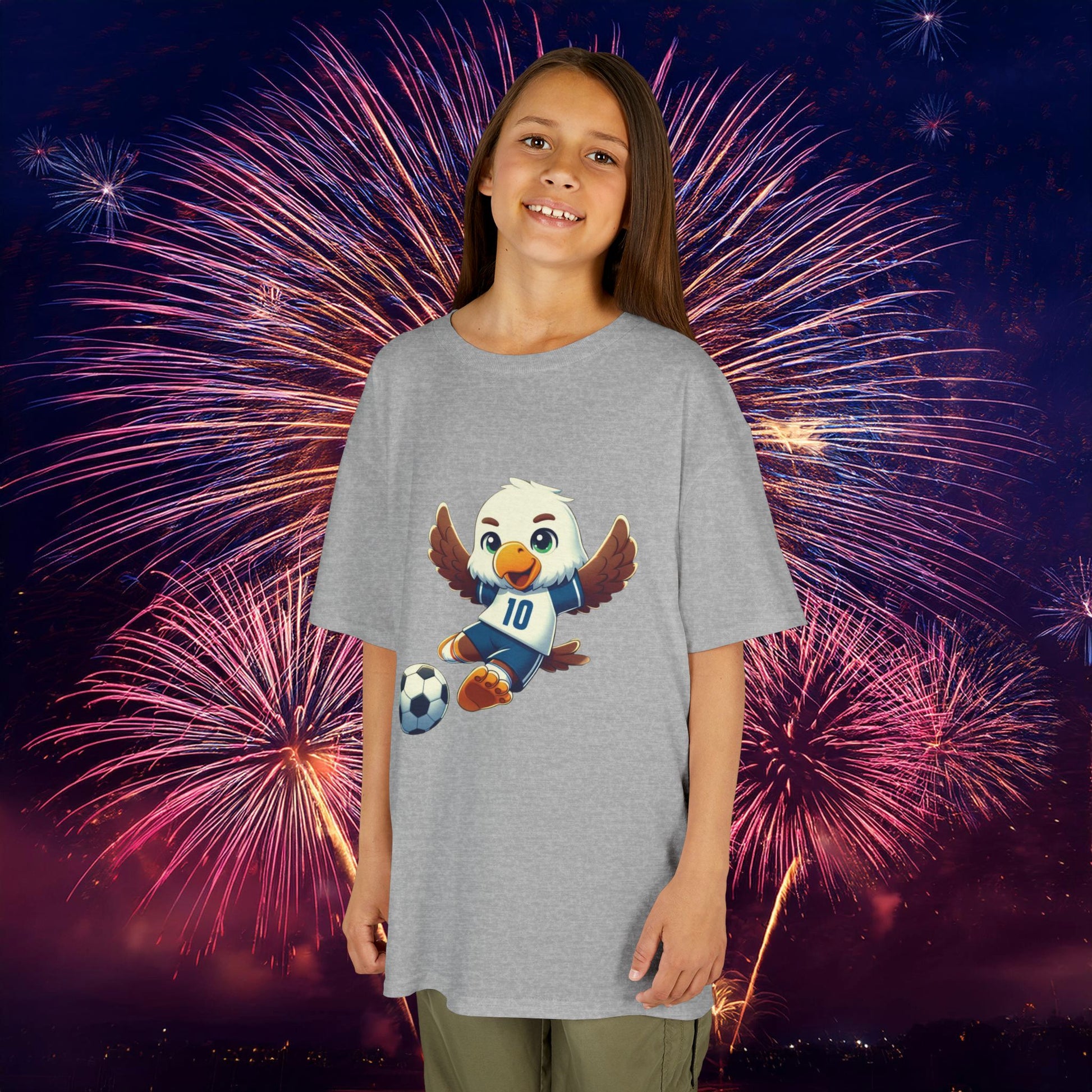 This USA Soccer themed kids heavy cotton tee is perfect for everyday use. The fabric is 100% cotton for solid colors. Polyester is included for heather-color variants. The shoulders have twill tape for improved durability. The collar is curl resistant due to ribbed knitting. There are no seams along the sides.