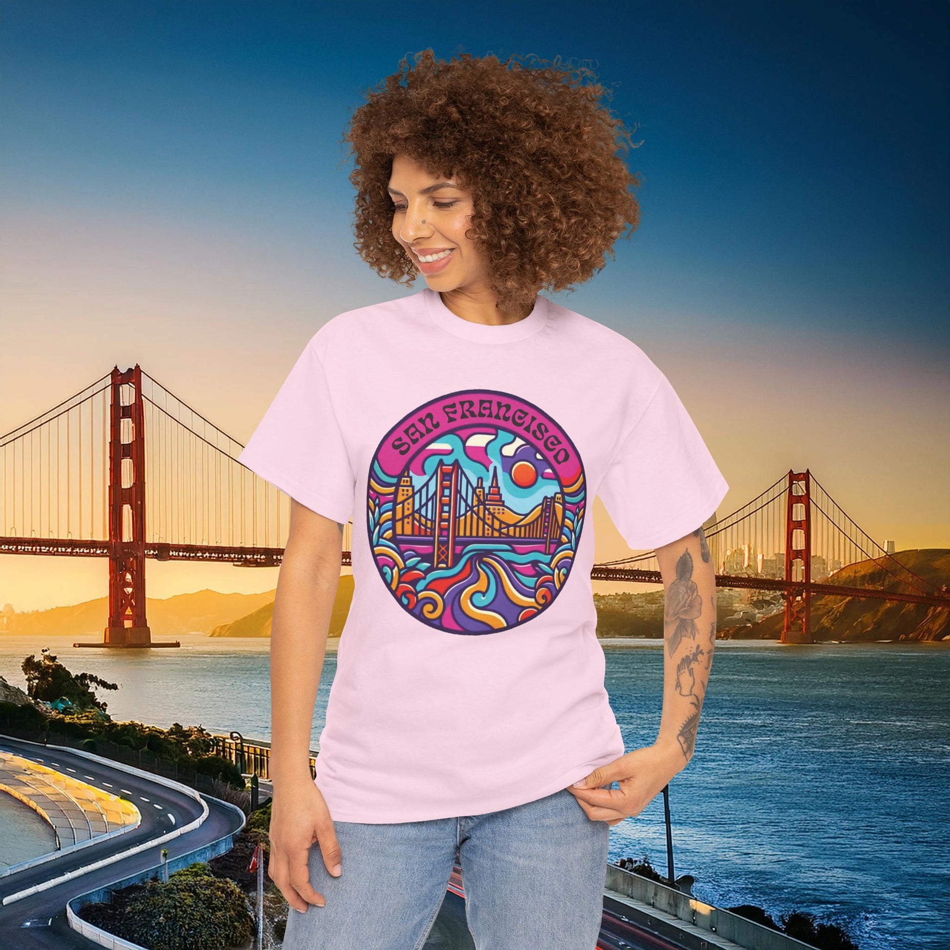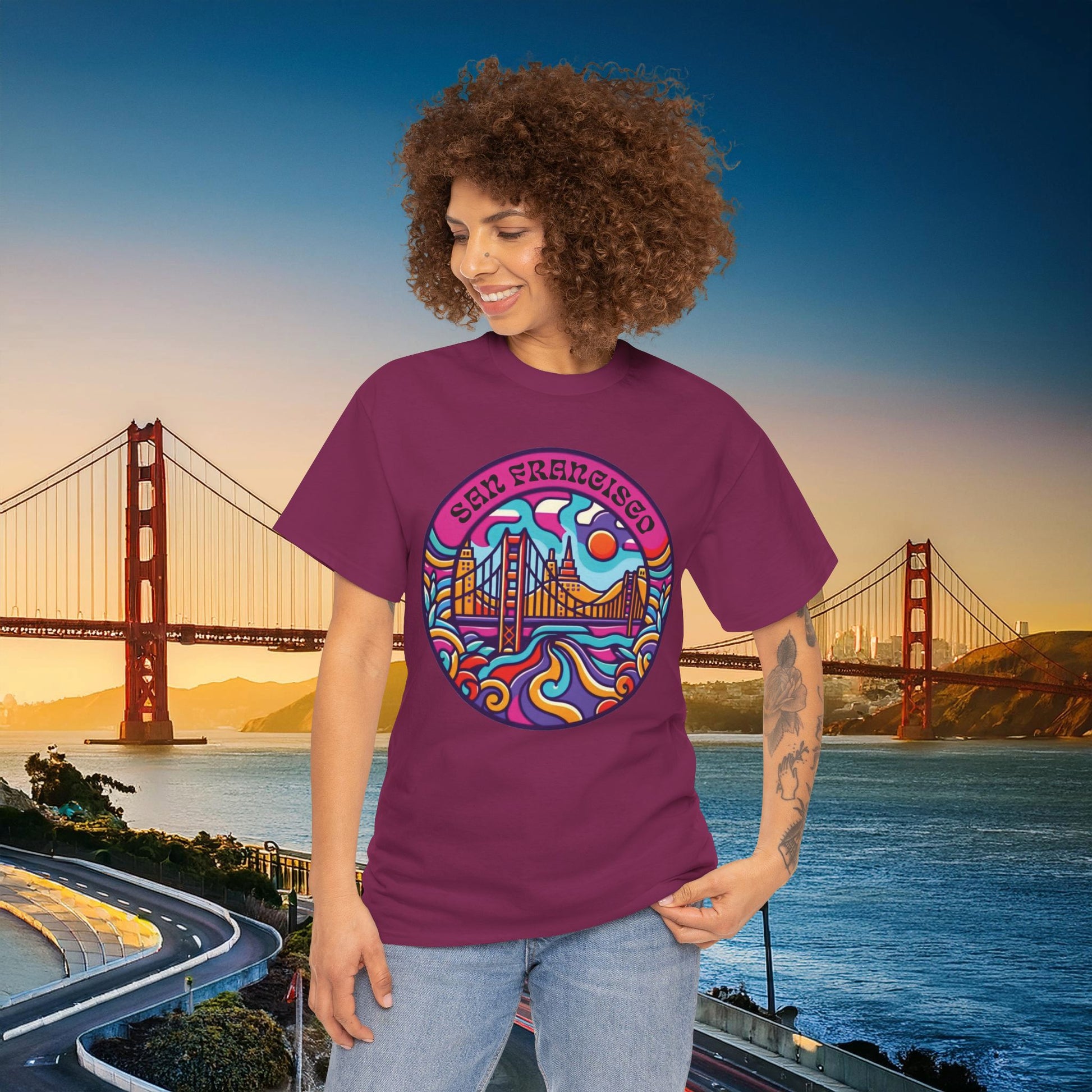 Introducing the perfect addition to your casual wardrobe: this San Francisco themed Unisex Heavy Cotton Tee combines vibrant design with comfort and style. Featuring a colorful San Francisco-themed graphic, this tee captures the spirit of adventure and creativity, making it a great choice for exploring the city or simply relaxing at home. Ideal for anyone who appreciates unique art, travel enthusiasts, or locals, it’s a fun way to express your love for San Francisco. Perfect for various occasions, from birthdays and holidays to casual get-togethers and family outings, this tee is a versatile piece that complements any outfit.