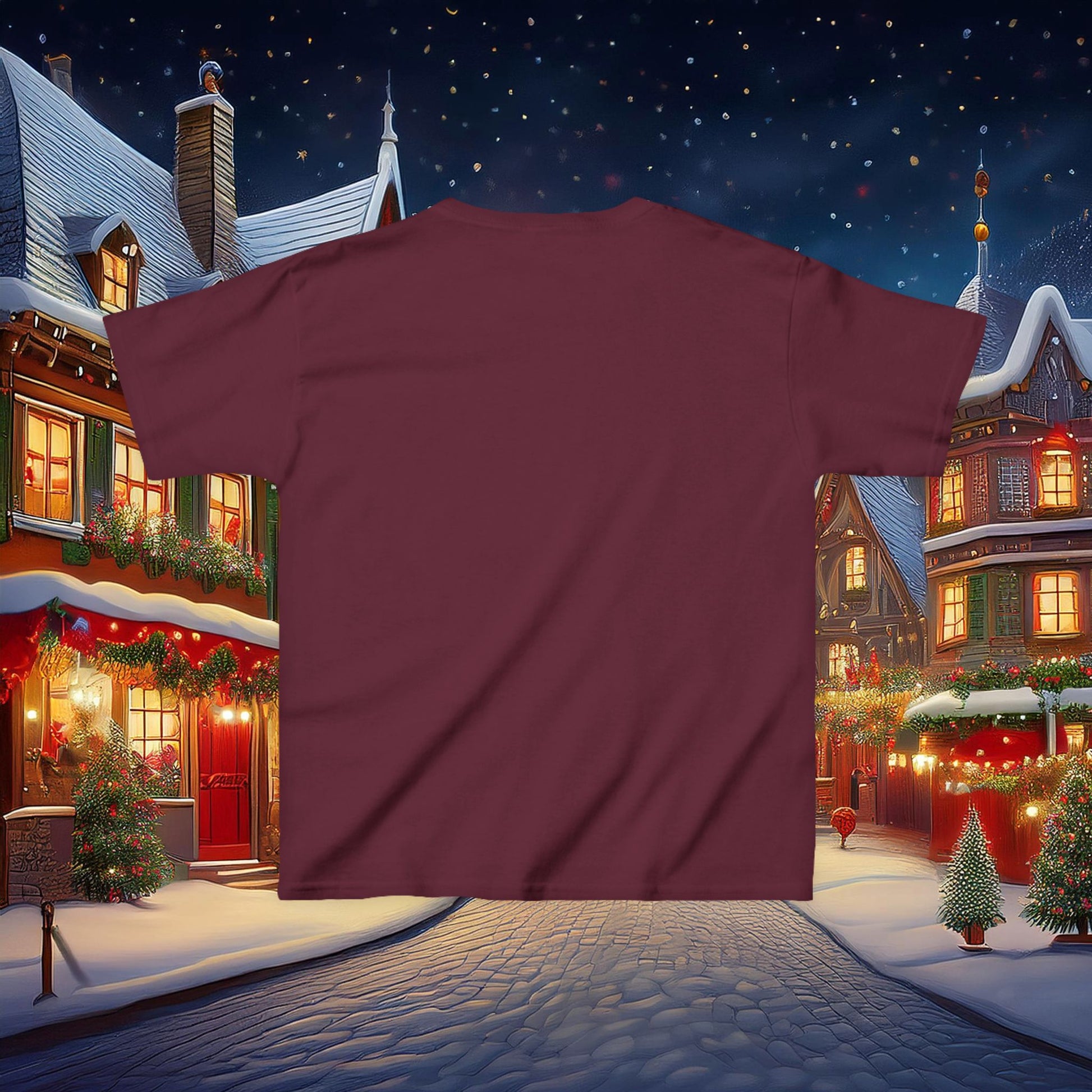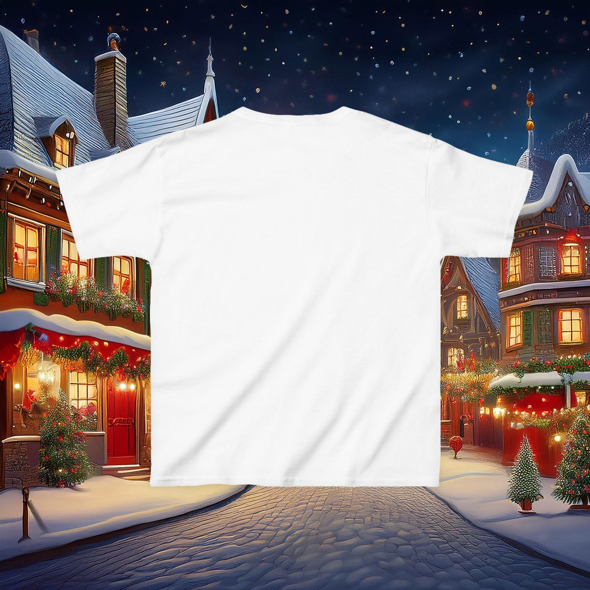 This Christmas themed kids heavy cotton tee is perfect for everyday use. The fabric is 100% cotton for solid colors. Polyester is included for heather-color variants. The shoulders have twill tape for improved durability. The collar is curl resistant due to ribbed knitting. There are no seams along the sides.