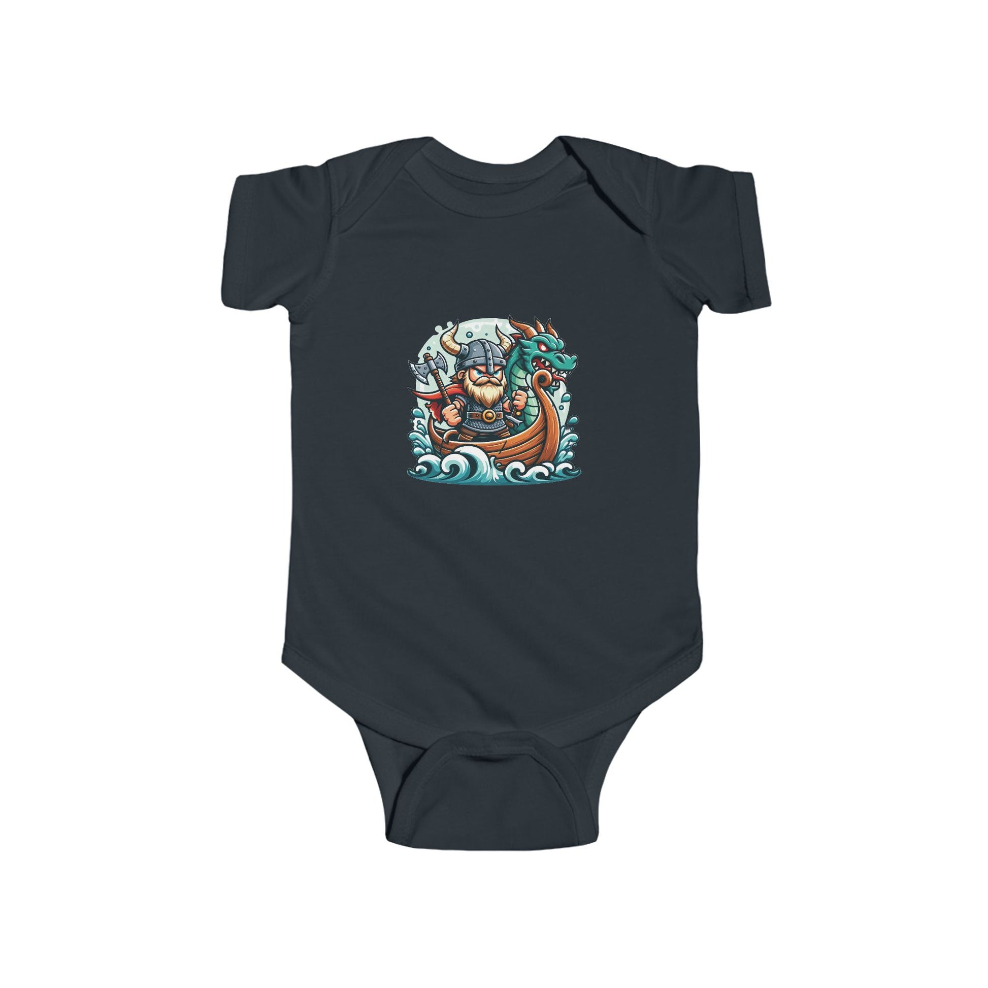 Baby clothing needs to be both durable and soft. With this Viking themed infant fine jersey bodysuit, youths get just that. The fabric is 100% cotton for solid colors. For heather colors, polyester is included. There are seams along the sides of this product. All bindings are made with ribbed knitting for improved durability. There are plastic snaps at the cross closure for easy changing access.