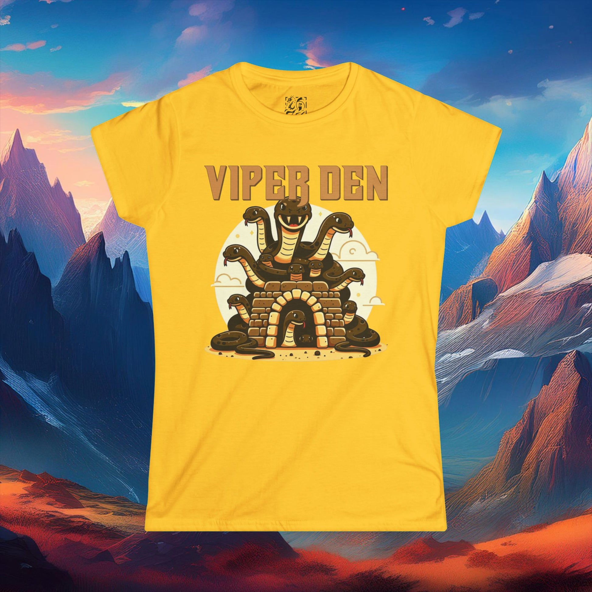 This Viper Den woman's softstyle tee is a more feminine take on the classic tee. The sleeves are shortened to reveal some shoulder. The fabric is 100% ringspun cotton for all solid colors. The shoulders are taped with twill to prolong durability. The collar seam is reinforced with ribbed knitting.
