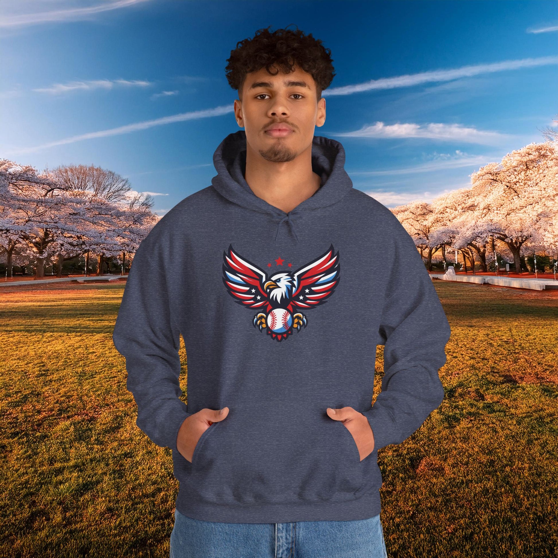 This Washington Nationals themed heavy blend hooded sweatshirt is relaxation itself. Made with a thick blend of cotton and polyester, it feels plush, soft and warm, a perfect choice for any cold day. In the front, the spacious kangaroo pocket adds daily practicality while the hood's drawstring is the same color as the base sweater for extra style points.