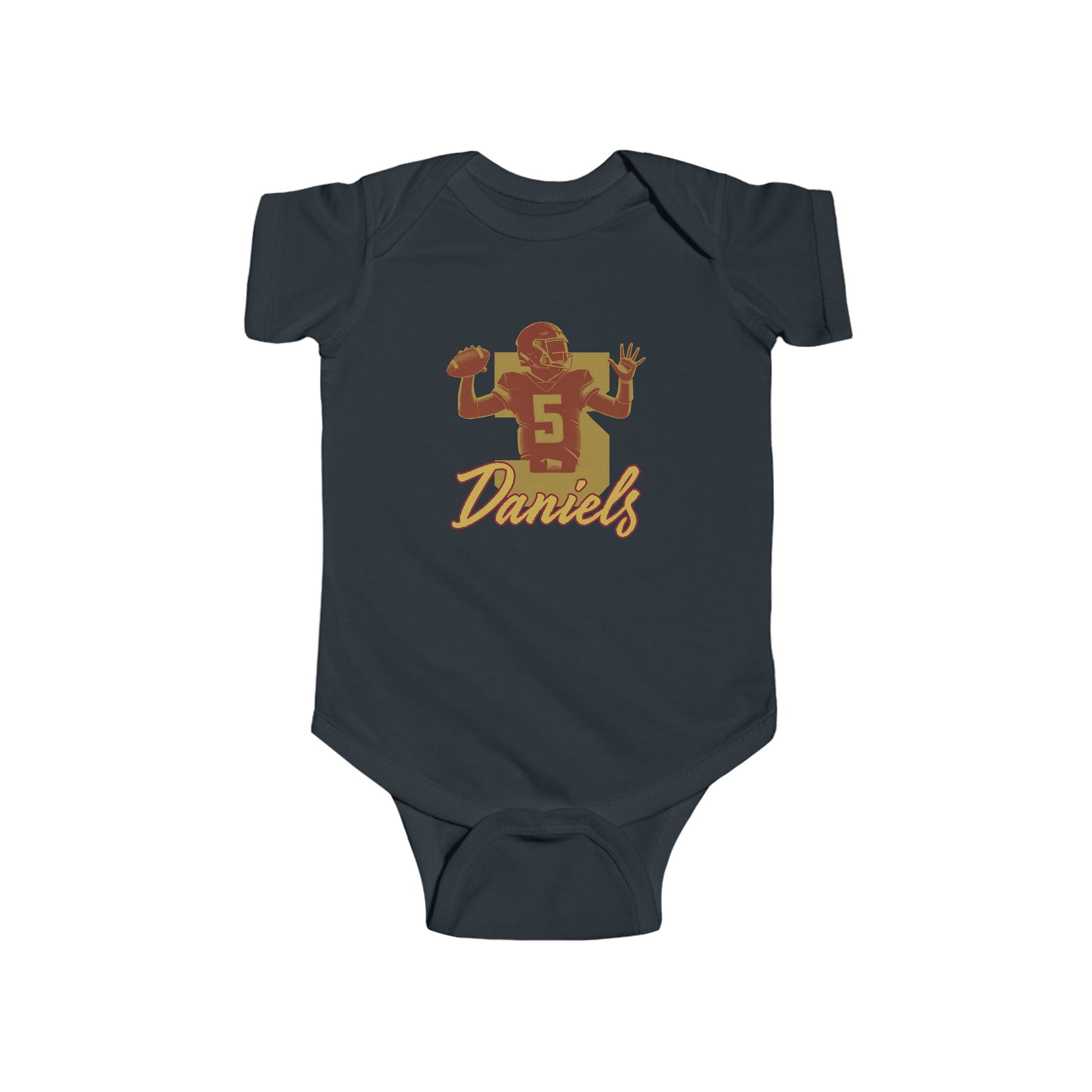 Baby clothing needs to be both durable and soft. With this Washington Commanders themed infant fine jersey bodysuit, youths get just that. The fabric is 100% cotton for solid colors. For heather colors, polyester is included. There are seams along the sides of this product. All bindings are made with ribbed knitting for improved durability. There are plastic snaps at the cross closure for easy changing access.