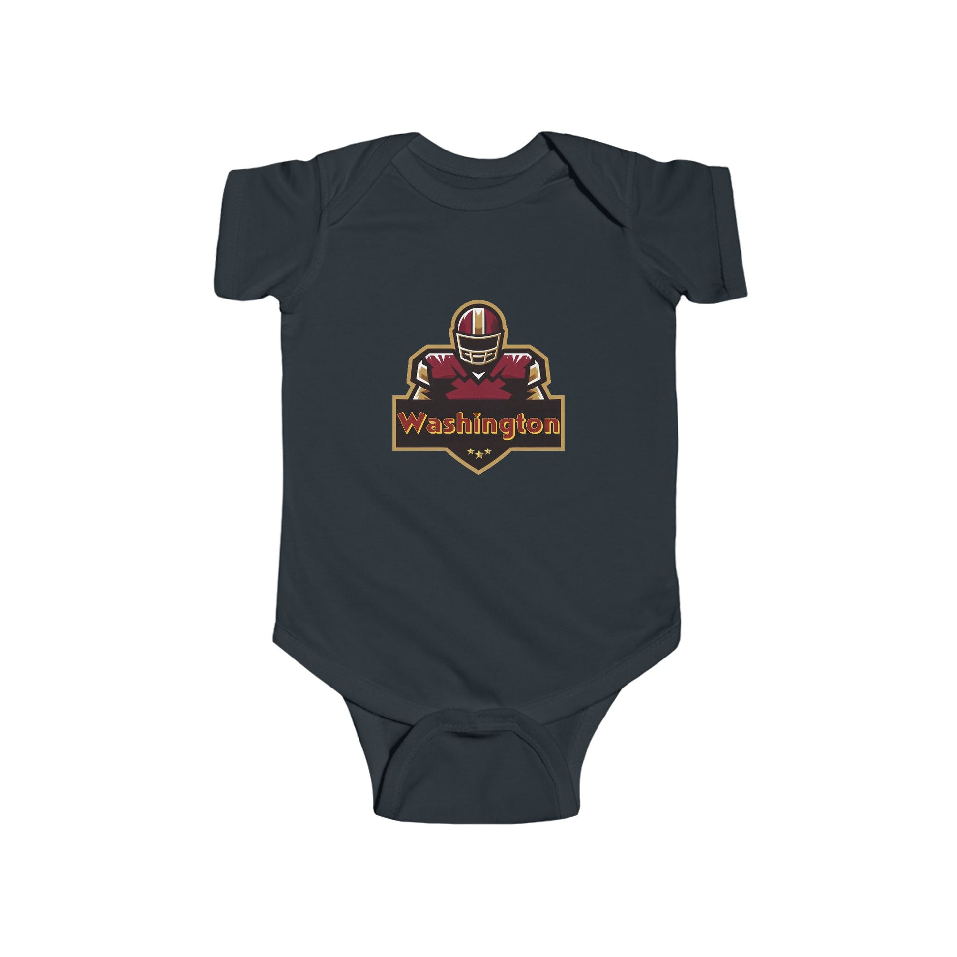 Baby clothing needs to be both durable and soft. With this Washington Commanders themed infant fine jersey bodysuit, youths get just that. The fabric is 100% cotton for solid colors. For heather colors, polyester is included. There are seams along the sides of this product. All bindings are made with ribbed knitting for improved durability. There are plastic snaps at the cross closure for easy changing access.