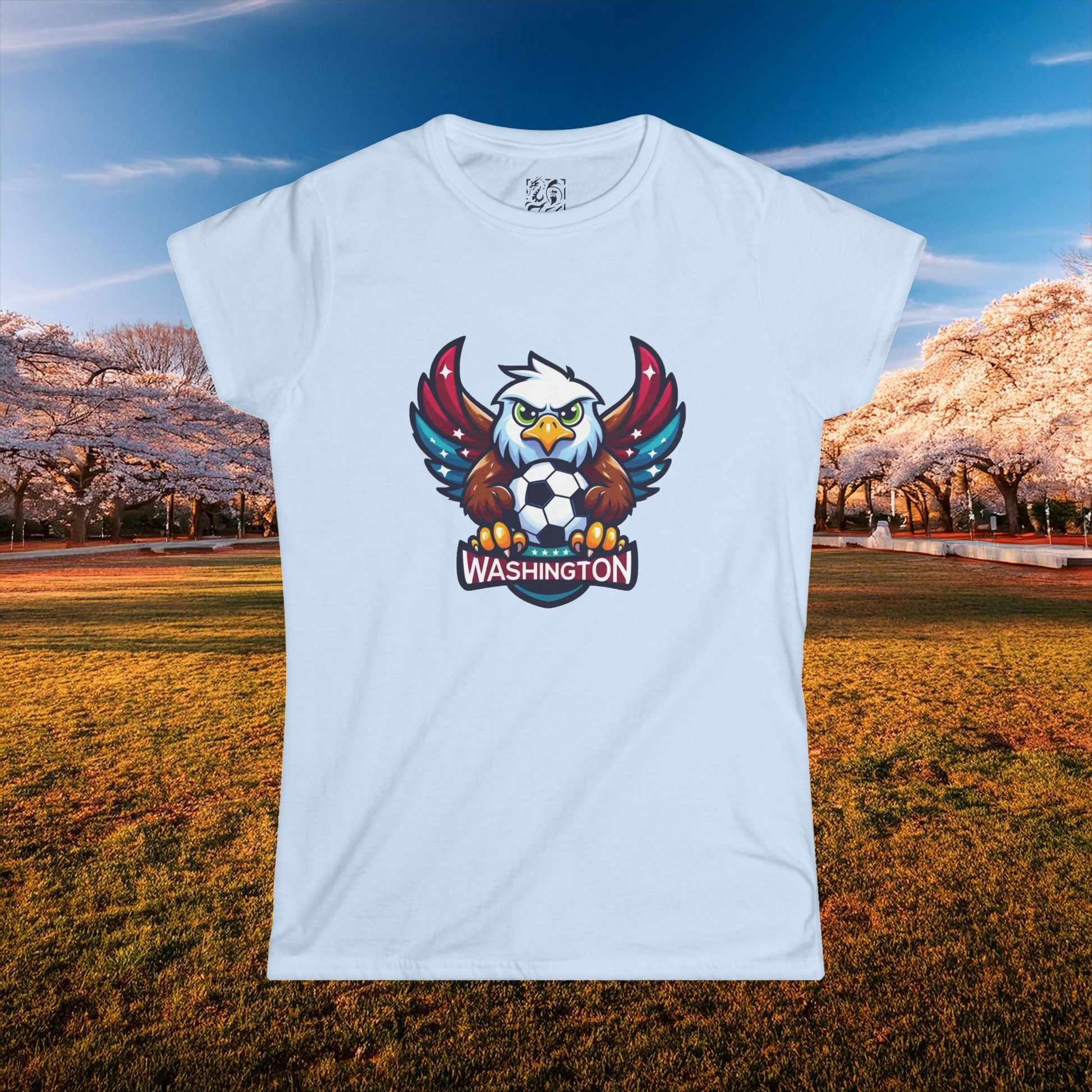This Washington Spirit themed woman's softstyle tee is a more feminine take on the classic tee. The sleeves are shortened to reveal some shoulder. The fabric is 100% ringspun cotton for all solid colors. The shoulders are taped with twill to prolong durability. The collar seam is reinforced with ribbed knitting.