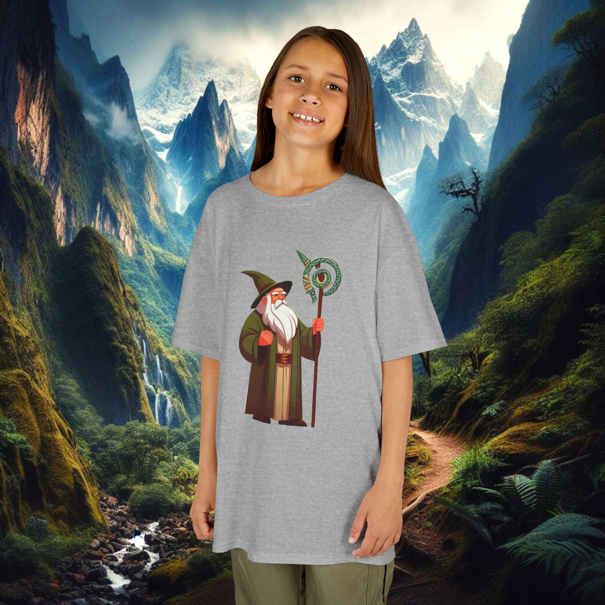 This fantasy themed wizard kids heavy cotton tee is perfect for everyday use. The fabric is 100% cotton for solid colors. Polyester is included for heather-color variants. The shoulders have twill tape for improved durability. The collar is curl resistant due to ribbed knitting. There are no seams along the sides.